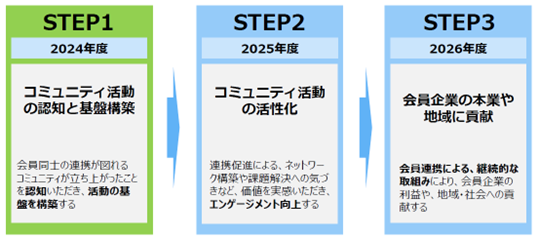 中期的な活動ステップとして、まず活動初年度となる2024年度は、認知向上と基盤構築の時期と位置付けています。これから始まる2025年度は、各部会で参加者の増加と対話の活性化を図り、2026年度には会員の本業や地域への貢献を実現したいと考えています。