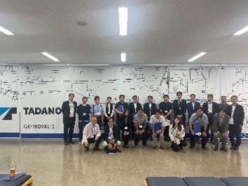 次に、株式会社タダノ様の香西工場の視察に伺いました 。こちらの工場は2019年出来た、最新鋭の工場で、ラフテレーンクレーンやトラッククレーンなど大型特殊車両の製造されており、現場におけるAIイノベーションの具体的な導入事例について深く学ばせていただきました。