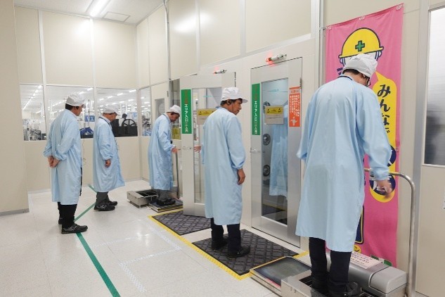 静電気対策として静電靴のチェックを欠かさず行っています。クリーン化対策として工場内を加圧し、外気からの塵や異物混入を防ぎながら、常にきれいな空気を取り入れている点も紹介。