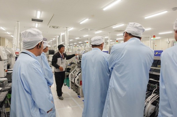 工場では、プリント基板への部品実装工程や製品組み立ての現場を間近で見学。