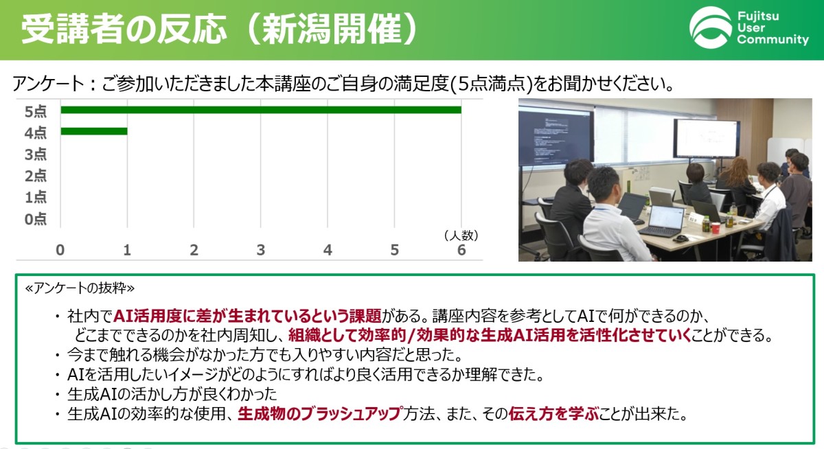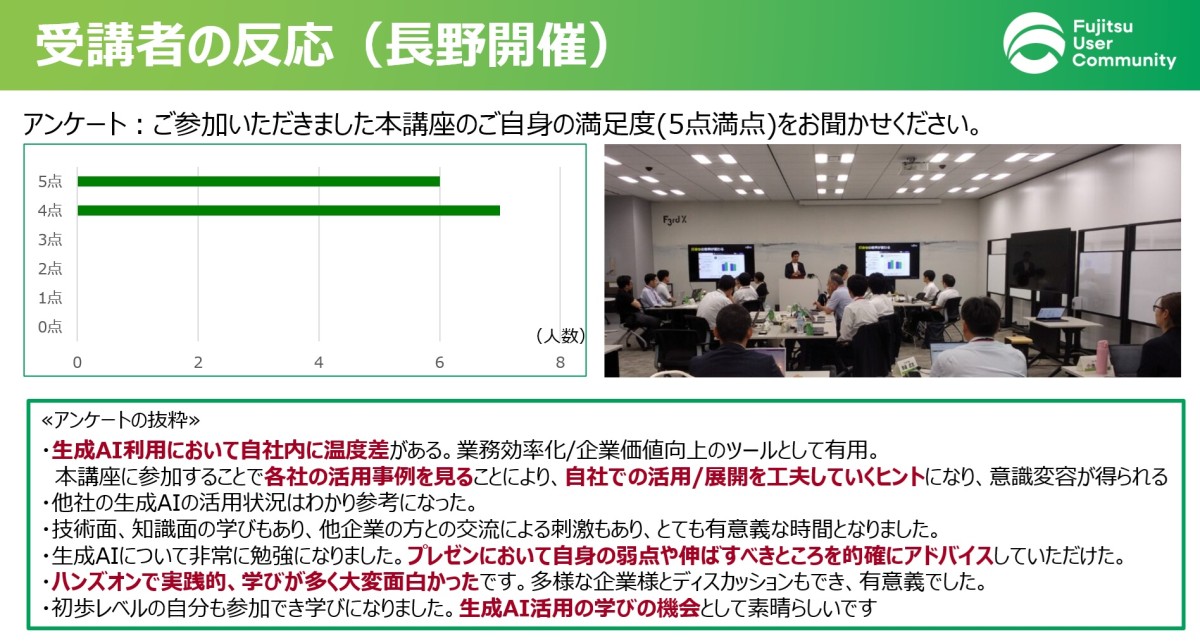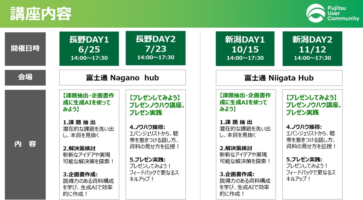 講座内容としては、長野6/25、7/23、新潟10/15、11/12のそれぞれ2日程での開催とし、DAY1においては、生成AIを活用して効率化、効果的に課題抽出から解決策検討、企画書を作成するノウハウを習得、DAY2においては、講師(富士通エバンジェリスト)から聴衆を惹きつける話し方、資料の見せ方などのノウハウを学び自組織の課題解決プレゼンを行っていただきました。