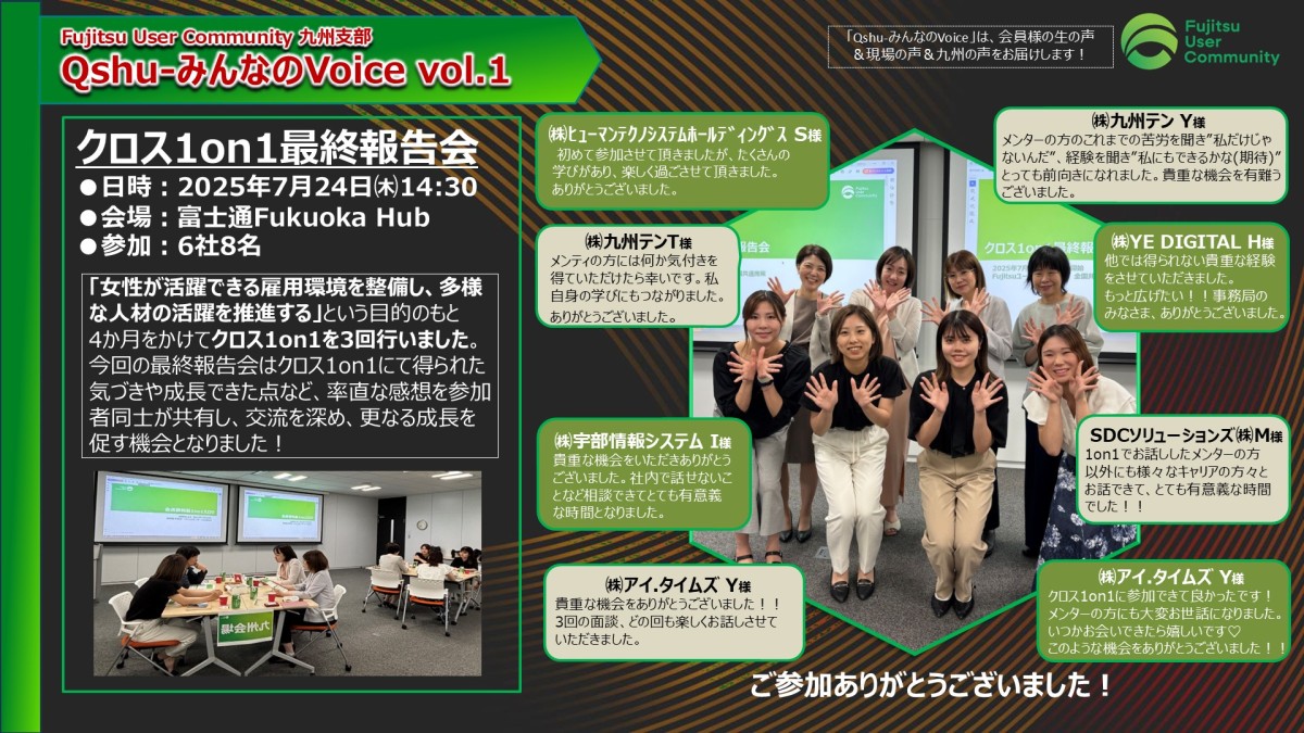 7/24(木):【全国共通施策:女性活躍推進(全4回):クロス1on1最終報告会】 ■開催場所:富士通 Fukuoka Hub 6階 Seminar Room C/D(福岡)<終了> |