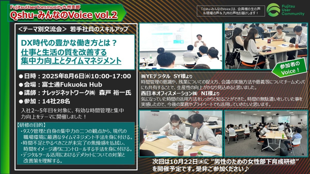 8/6(水):【支部主催 テーマ別情報交流会:若手社員のスキルアップ】 (対象:入社2~5年目の若手社員)■申込締切:7/29(火) ・DX時代の豊かな働き方とは? 【開催場所:富士通Fukuoka Hub 6階 Seminar Room A・ B/形式:集合】 ご案内状はこちら<終了> |